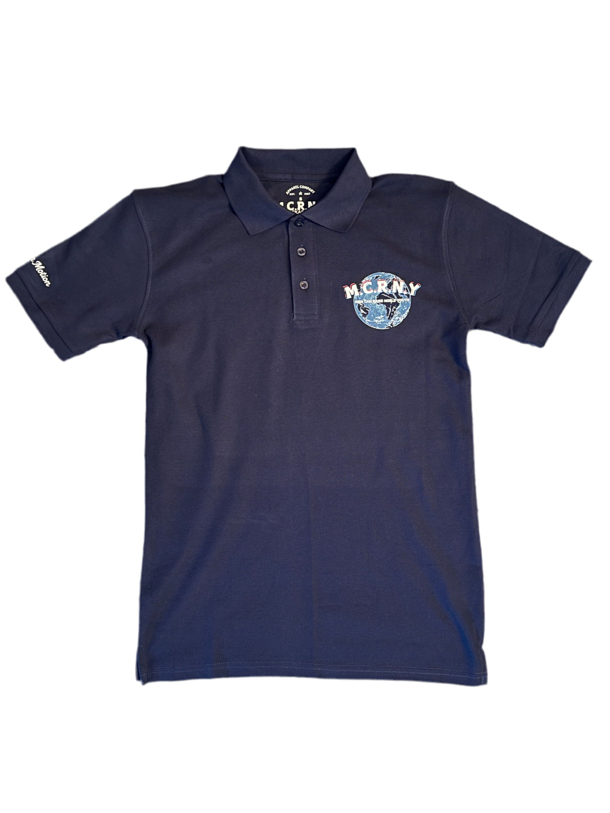 Step into style with the MCRNY Polo, a sleek blend of comfort and statement design. Crafted in deep navy, this polo features a bold globe graphic with the signature M.C.R.N.Y logo on the chest and back — representing Men Can Raise Noble Youth. The detailed print carries a modern edge, while the embroidered-style script on the sleeve adds a premium finish.